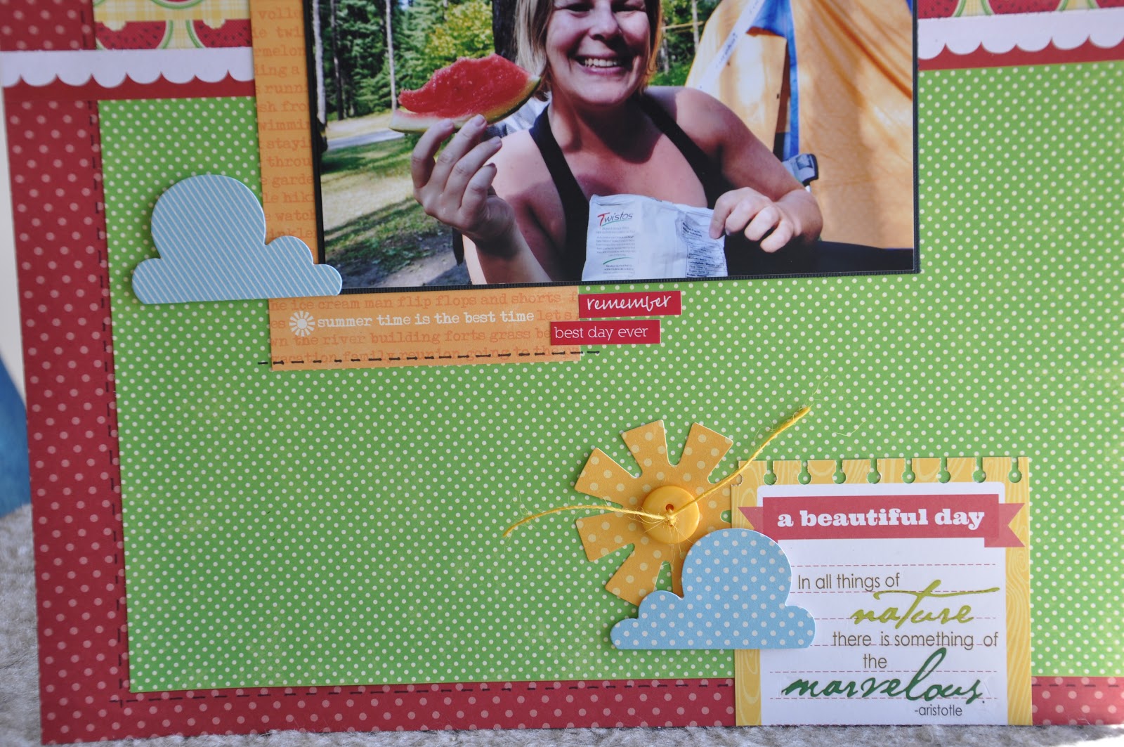 This is my layout for Becky Fleck's Sketch challenge from her blog. I have had this watermelon paper set aside and have been wanting to use it forever! I have tried more than once to come up with a layout using it and today something clicked! The paper is Watermelon Gazpacho Soup by Jillibean Soup. I am not sure where I got the paper from but I did not buy the whole line and had to combine new and old together to get a finished product. The background red paper is from Pebbles basics. The strip in the middle is the bottom of the Pebbles paper- I love how they make that tear off strip re-usable by having a design on one side...so smart!